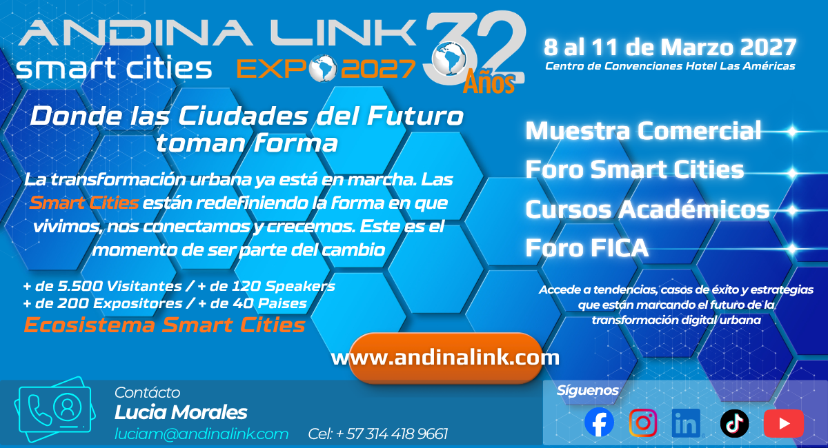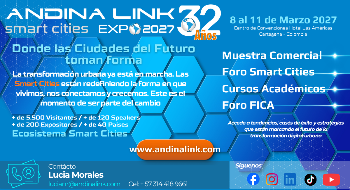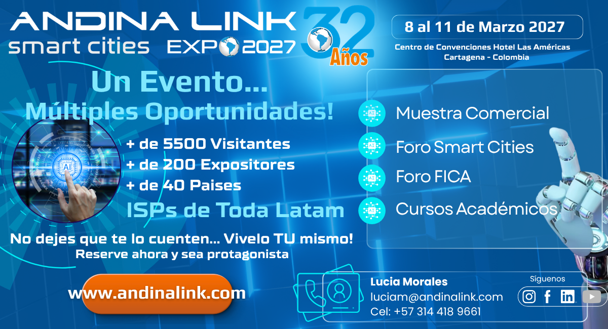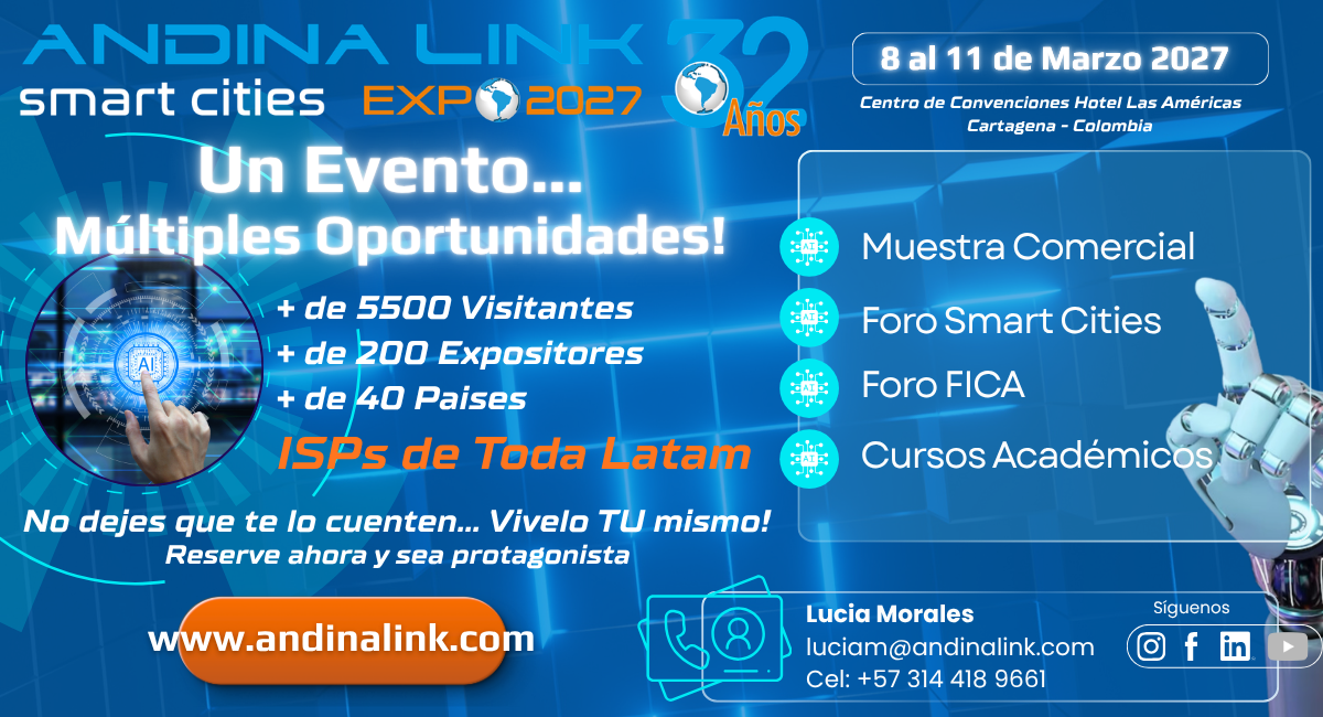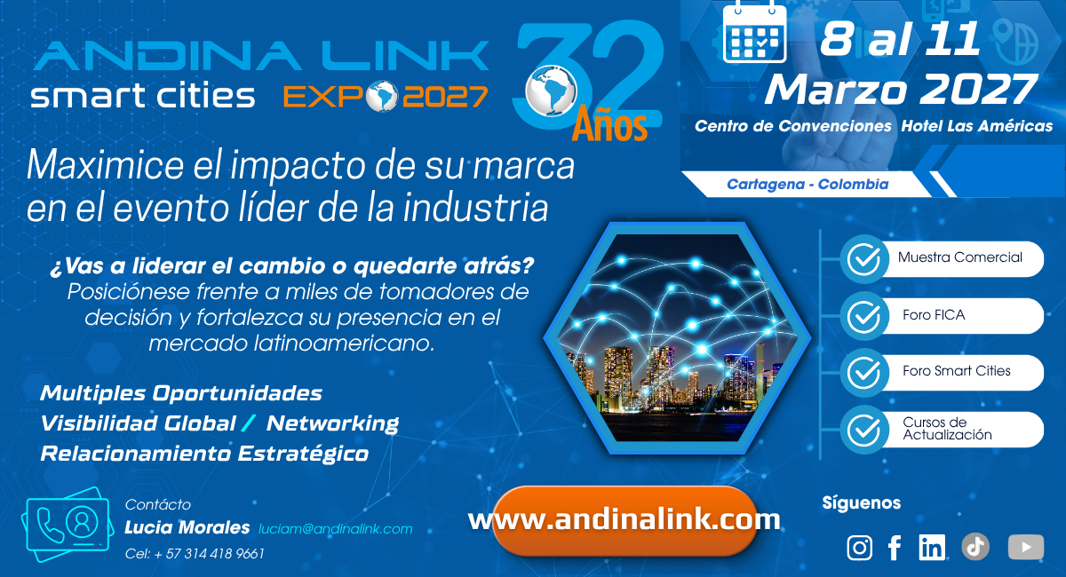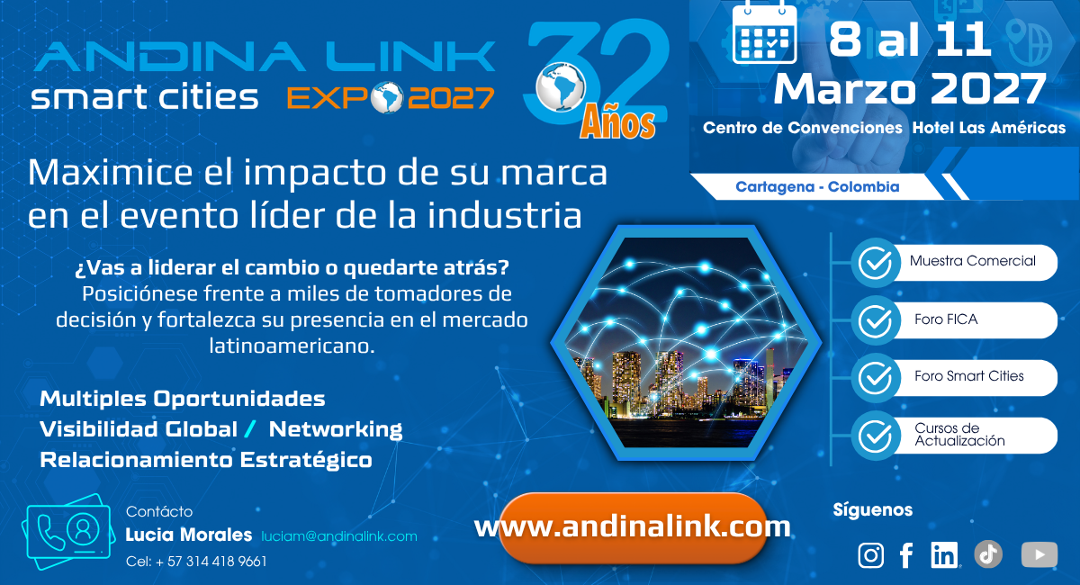Por más de tres décadas, Andina Link ha sido el epicentro de la evolución tecnológica en la región. En 2027, damos un salto hacia una nueva era: hiperconectividad, inteligencia artificial avanzada, ecosistemas digitales inteligentes y ciudades impulsadas por datos. Del 8 al 11 de marzo Cartagena se convertirá nuevamente en el hub donde convergen líderes globales, visionarios y disruptores para redefinir el futuro de las telecomunicaciones, la infraestructura digital y las Smart Cities.
